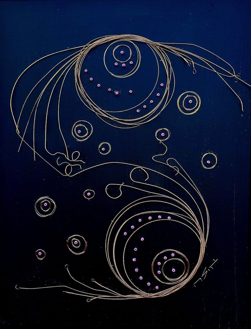 ButtonFrom The Center, 13x16 guitar strings metal wire, metal threads, glass beads, on acrylic painted canvas