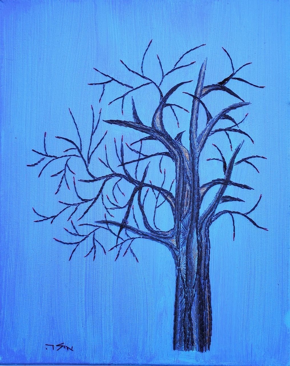Winter's end 16x20 embroidery Floss stitched on acrylic painted canvas